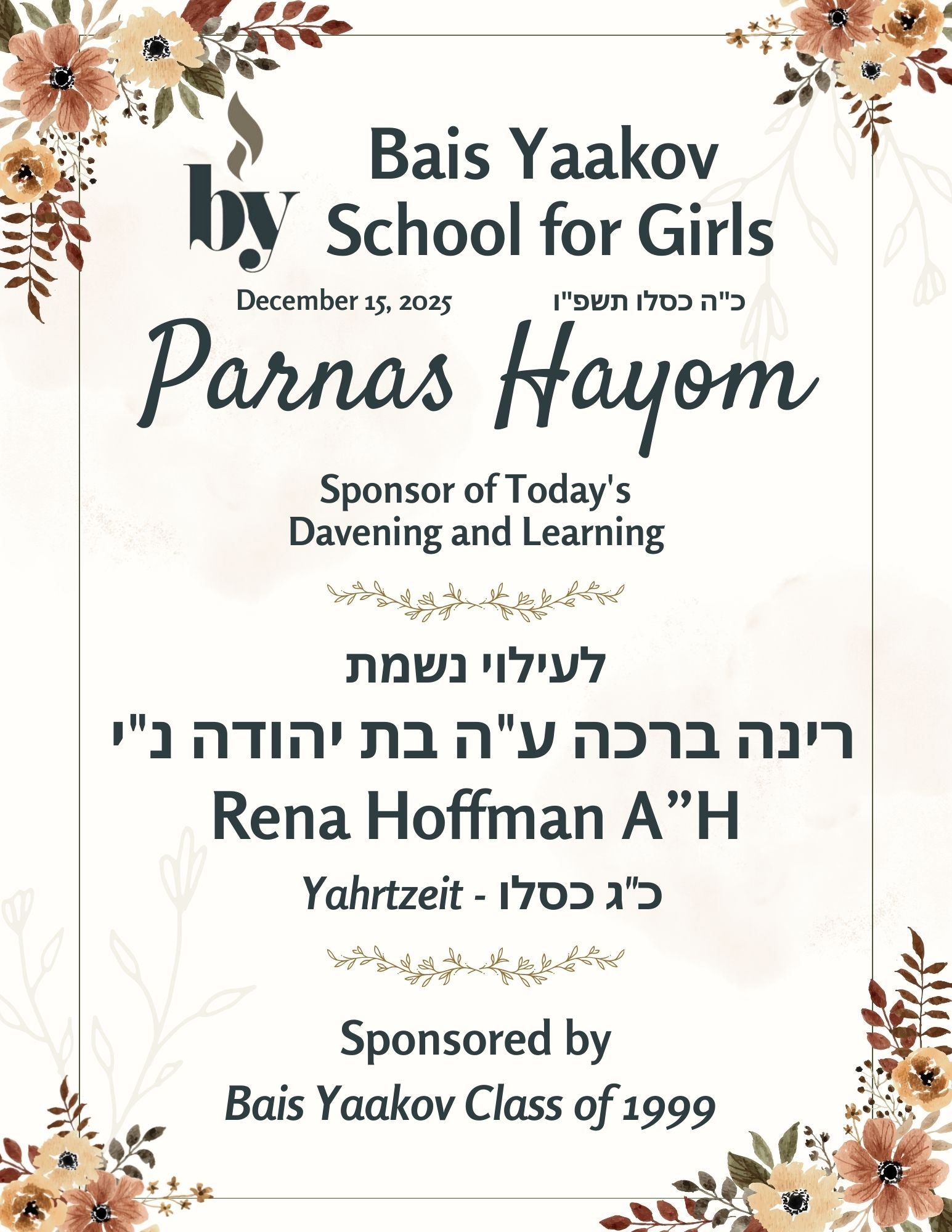 For centuries, Klal Yisroel has upheld the critical relationship between Torah learning and its support through the Parnas Hayom model of sponsorship, in which individuals share in the merit created by Torah study. Together, Tefilla and Torah study have always been the tried and true methods through which to invoke Divine assistance. Bais Yaakov is proud to continue this longstanding tradition by offering the opportunity to dedicate our students’ daily davening and learning.
